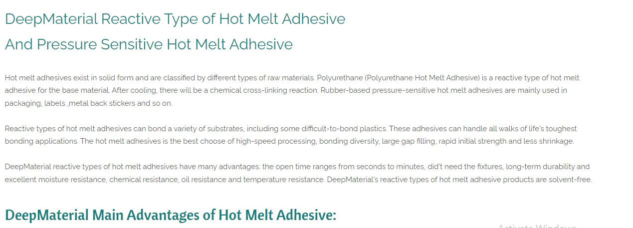 Hot melt adhesives exist in solid form and are classified by different types of raw materials. Polyurethane (Polyurethane Hot Melt Adhesive) is a reactive type of hot melt adhesive for the base material. After cooling, there will be a chemical cross-linking reaction. Rubber-based pressure-sensitive